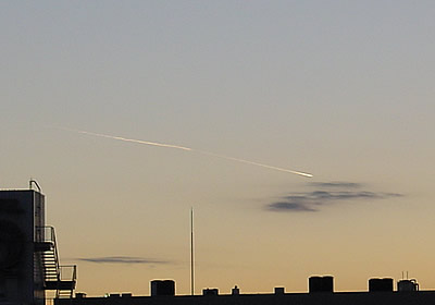 右の写真は夕方沈みかけた太陽の光を受けて輝いている飛行機雲。パッと見ると一瞬びっくりするような形ですよね。