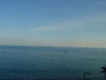 左はそんなコテージから見た夕方の海。初島とかすかに大島がみえます。