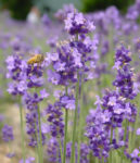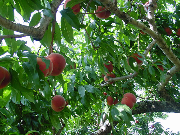 写真はハチが睨みながら蜜を集めるラベンダーと、鈴なりの桃。