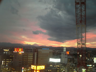 待ち合わせのカフェはデパートの8階。西側に大きな窓があり、ちょうど夕焼けがキレイで久しぶりに写真撮りましたよ、携帯でだけど。