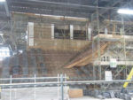 最上階から天守閣の屋根(すでに瓦を葺きおわり、平成の鴟尾も設置済み)あたり、その下の階からは天守閣の壁(幻の窓は再び塞ぐようです)やその下の屋根の様子がよく見えます。写真はちょっと反射しちゃってますね。