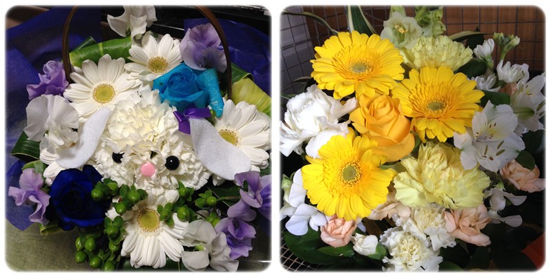 写真左のはカーネーションで顔を形作りフェルトの耳までついててビックリですよ!