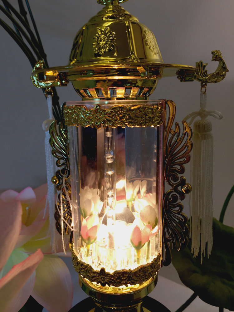 不祝儀もあって一緒にお見送りしてきたのですが、祭壇の脇にあった蓮華灯がこんなので、思わず撮ってきちゃった。