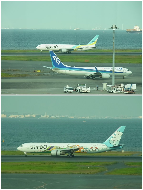 右の写真は上が普通のエアドゥ、下がカワイイ塗装のエアドゥ。柄にちなんでベアドゥと呼ばれたりするようです(今日も台風近づく強風の中着陸し、夕方北海道に向かっておりました)。 エアドゥのサイトにも塗装に関する情報は無いのですけど、もう1機違う柄のカワイイのがとまっておりました。