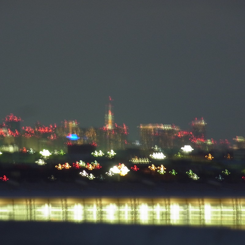 そうこうしているうちに夕暮れになり、滑走路や誘導路の灯りがともり、遠くに見える東京ゲートブリッジも青くなり、ビルの灯りもみえて、うひょひょな時間帯。けれど、この時間帯のコンデジは使い物にならないので、一応台の上に置いて4秒露光で東京タワー撮ったけど、やっぱりブレブレ(笑) 手前の白い灯りはいつの間にか増えてた国際線の駐機場。