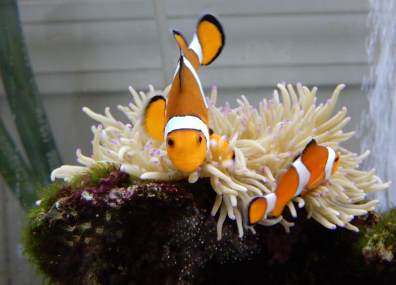 縄張り意識が強いので水槽の中には他に魚はおらず、彼らが隠れるためのイソギンチャクと岩だけ入ってる、割と殺風景な水槽です。