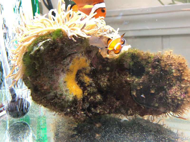 ずっと飼われてるから見知らぬ人が近づいても卵に水を送り続けるのだけど、スマホで撮ろうとするとイソギンチャクの影に隠れる。おかげで卵は撮りやすかったけど、邪魔してゴメン。
