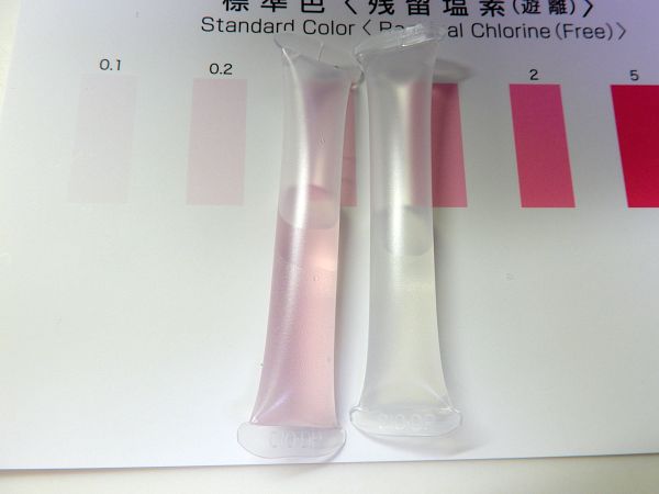 知りたいのは硬度ですが塩素濃度も測れるので、水道水と浄水とを比べてみました。試薬の入った筒状の、黄色いのを引っ張りそこから水を吸い込み試薬と混ぜ、規定時間に標準色と見比べます。