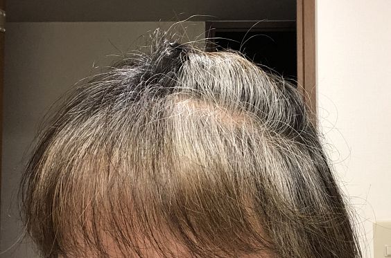普段この辺は隠れちゃってますけど、顔周りが白く、つむじの周りは割と黒いし、染めた色も残っているので、なかなかおもしろい状況です。後ろは前よりは黒いの多いです。