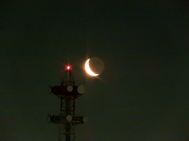 月が昇ってるのに気づいたときにはまだ暗くて、ちょうど鉄塔と重なってるところで慌ててカメラ持ちましたが、適切なモード(ISO3200)にするのにあたふたしてたら鉄塔から外れちゃいました。まぁそれでも、手持ちで地球照が撮れたので私は満足です(一秒露出だから手ぶれもしょうが無いっ)。