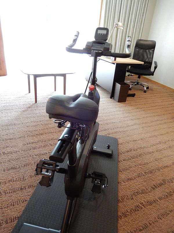 オットが手配してたのですが行ってみたら、ワーケーション(ホテル泊まりながら仕事しやすい環境ありますぜプラン)用のコネクティングルームで、寝室の部屋と机とモニターとプリンターにソファーにエアロバイクまである部屋でびっくらこきました。