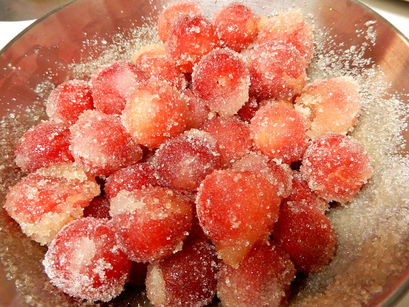 400gほどあり、あまり考えずグラニュー糖ときび糖を100gずつ投入し、丸1日冷蔵庫で寝かしてしまいました。一晩ぐらいで煮るつもりだったんですがたっぷり水分が出たのであとはもう煮るだけです。