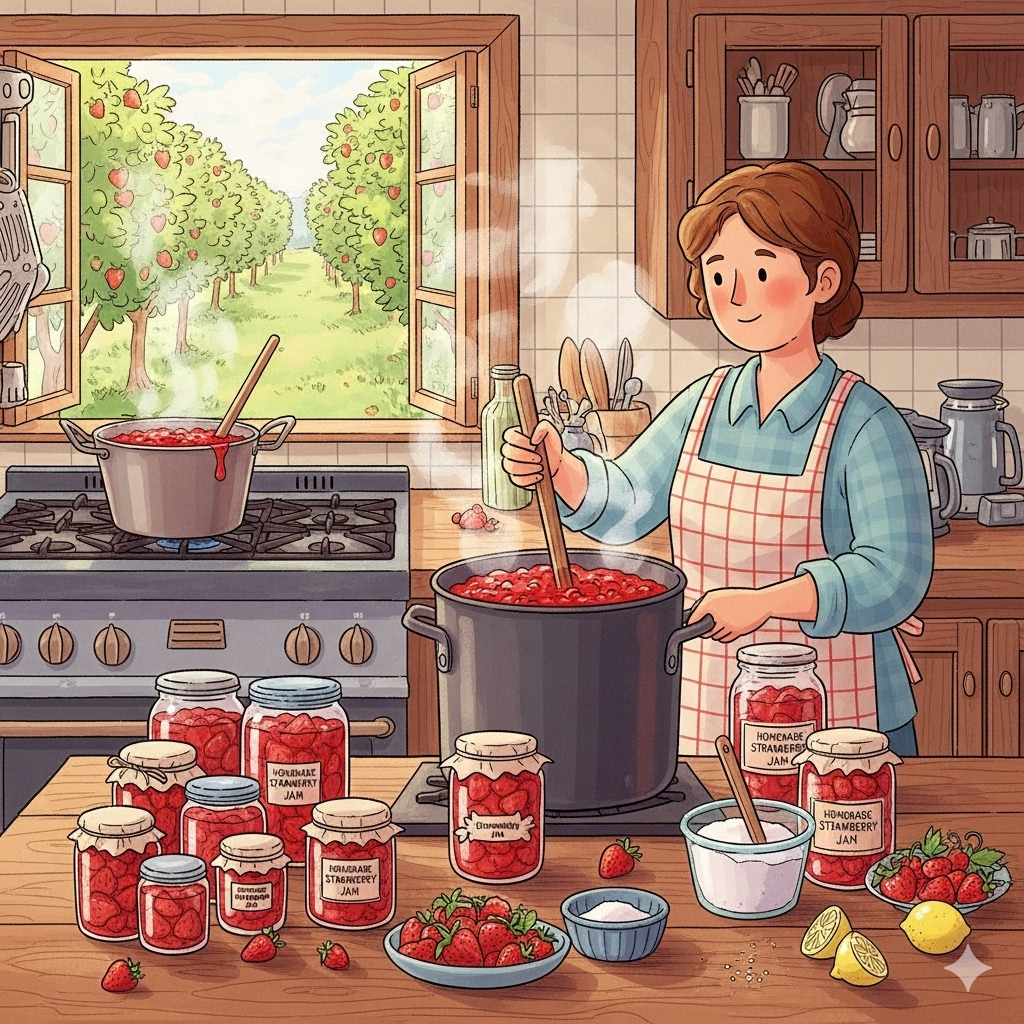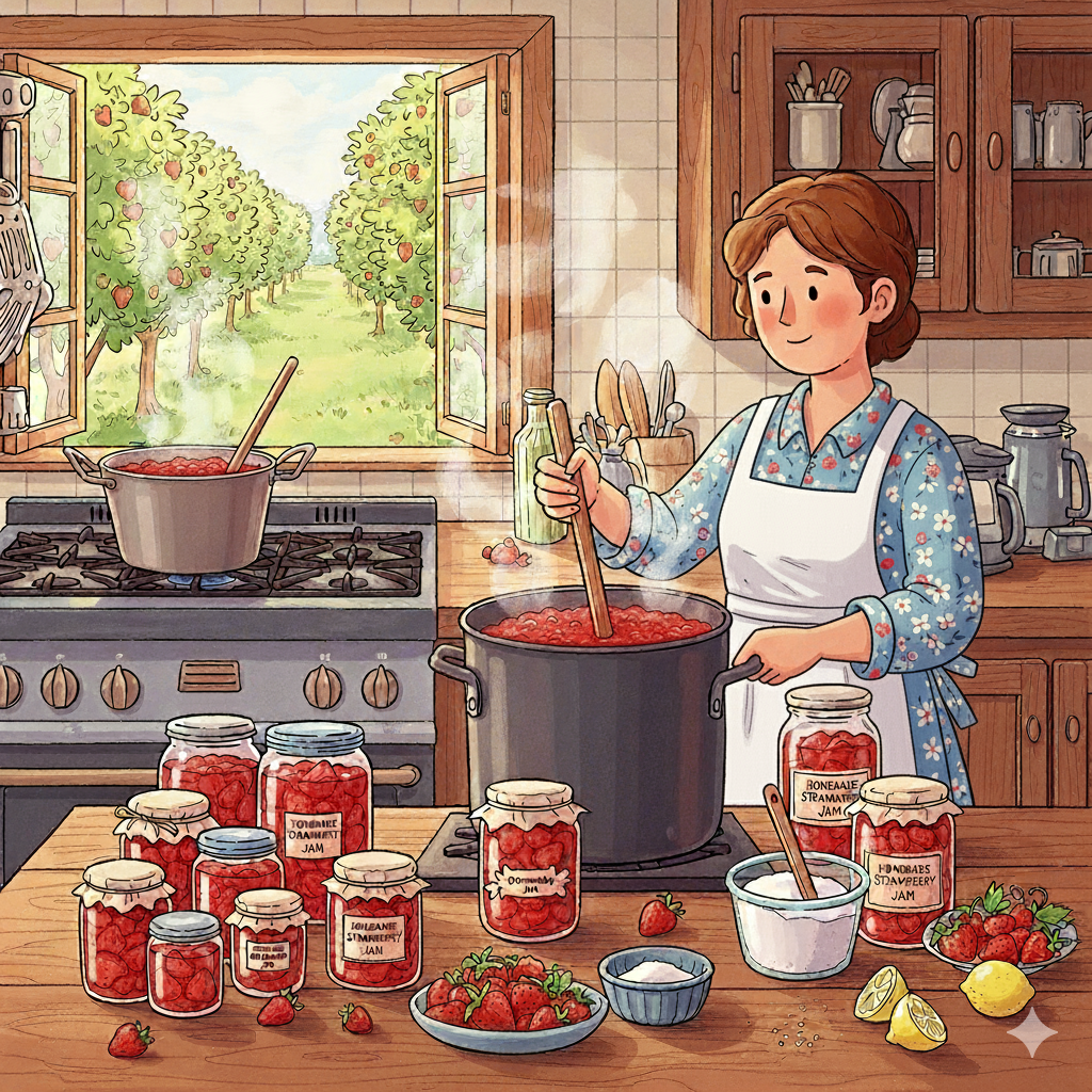 イチゴが木になっているという間違いがあるあたりがAIぽくて良いと思いますが、もしやイチゴじゃ無いのか?? でもジャムのラベルもストロベリーだし……